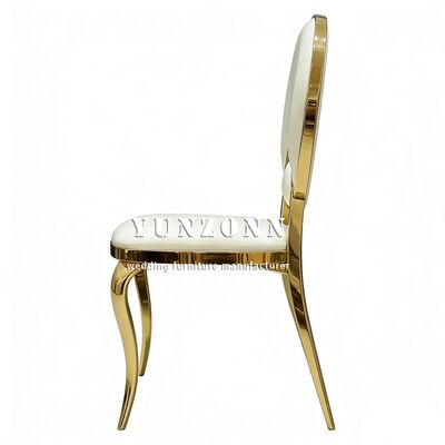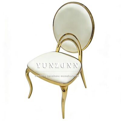 | Nazwa produktu: | Tanie krzesło hotelowe na imprezy weselne, meble, biała poduszka PU, złoty okrągły tył ze stali nierdzewnej, krzesło do jadalni dla panny młodej i pana młodego |