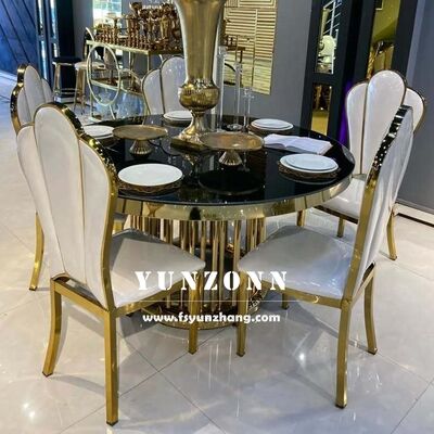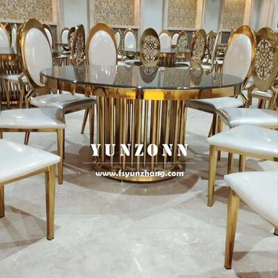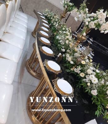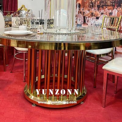 | Nazwa produktu: | Luksusowy stół hotelowy ze stali nierdzewnej, złota metalowa podstawa, szklany blat, na wesele, serpentynowy/okrągły |